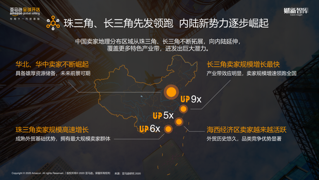 趋势一:卖家地域和类型更多元。卖家地域分布日益广泛,从珠三角、长三角不断向内陆延伸,海西经济区、中部、北部地区卖家规模快速增长。其中,长三角地区作为我国传统制造业聚集地,过去五年卖家增速最快,卖家规模增长达9倍;珠三角地区卖家规模增长达6倍,该地区产业集中、人才资源丰富,外贸基础成熟,孕育了目前全国最大规模的卖家群体;以福建为代表的海西经济区卖家日益活跃,卖家规模增长了5倍,在服装鞋靴、箱包、家具家饰、户外照明等品类竞争中表现出明显优势;华北、华中地区卖家逐步崛起,以北京为例,众多科技创新企业、传统知名品牌在全球初露锋芒。