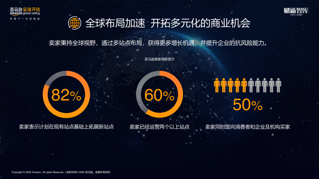 趋势二:全球布局加速。卖家国际化拓展步伐加快,并不断寻求多样化的商业机会。亚马逊全球开店中国卖家调研显示:近六成卖家已同时运营两个以上亚马逊海外站点,82%的卖家计划在现有基础上拓展新的站点。在加速布局全球的过程中,卖家不仅考虑美国、欧洲等成熟站点,也积极布局中东、澳洲、新加坡等新兴站点。此外,随着亚马逊企业购(Amazon Business)业务的发展,卖家积极尝试商业采购的新模式。调研显示,已有近50%的卖家同时面向消费者与企业及机构买家。值得注意的是,更广泛的全球布局、更多样化的商业模式,不仅为卖家打开新的增长机遇,也有效提升了企业的抗风险能力。