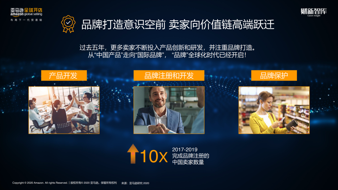 趋势三:品牌意识增强。随着出口跨境电商行业逐步转向"精耕细作",卖家更关注业务的长期发展,在产品开发、品牌注册与构建、品牌保护等方面持续投入。在产品开发方面,借助亚马逊海外站点消费者的一手反馈,卖家有效改进产品设计、提高产品质量、并指导新品研发,涌现出很多深受欧美消费者喜爱的产品,如Orolay的爆款羽绒服等。在品牌注册与构建方面,卖家利用跨境电商提供的轻量化方式打造国际品牌,在关注品牌注册同时创建自己的品牌故事,如泽宝。亚马逊数据显示,2017至2019年间,亚马逊上完成品牌注册(Brand Registry)的中国卖家数量增长就高达10倍。亚马逊通过品牌注册、Transparency透明计划、Project Zero等多项实用的工具和服务帮助卖家保护品牌。亚马逊数据显示,全球已经有超过20万品牌参加了品牌注册。