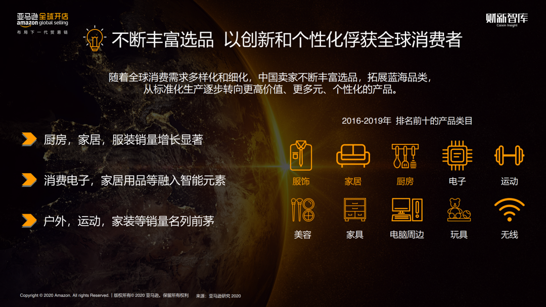 趋势四:产品创新提速。随着全球消费者需求更加多元和细化,中国卖家不断丰富选品,并逐步从标准化产品转向更高价值、更多元、更具个性化的产品。其中,厨房、家居、服装等品类销量增长显著;户外、运动、家装等品类选品不断丰富;消费电子、家居用品等品类紧跟潮流趋势,更多融入"智能"元素,推出智能手环、智能音箱、智能扫地机器人等产品,很多卖家创新地开发了结合亚马逊ALEXA技术的智能产品。
