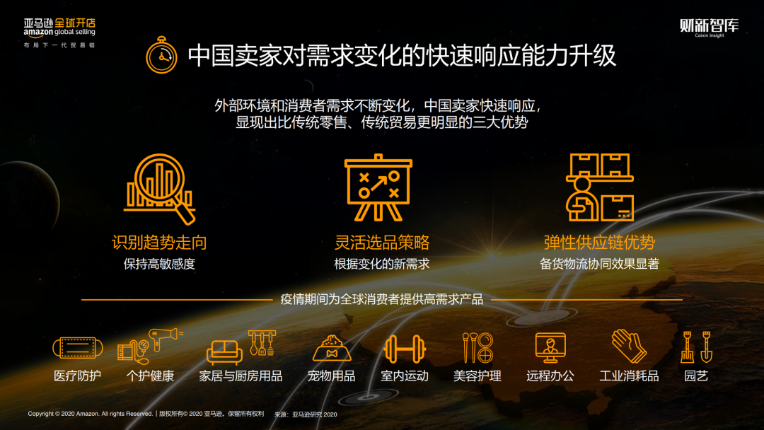 趋势五:响应能力升级。过去五年,卖家对海外环境与消费者需求变化的快速响应能力不断升级,能够快速识别全球消费趋势走向并灵活调整选品策略,尽显柔性供应链优势。疫情期间,中国卖家及时为全球消费者提供了高品质的防疫物资和生活必需品,在居家生活、远程办公等新场景驱动下,为海外消费者提供了家居、厨房用品、个护健康、室内运动、宠物、园艺等高需求产品。