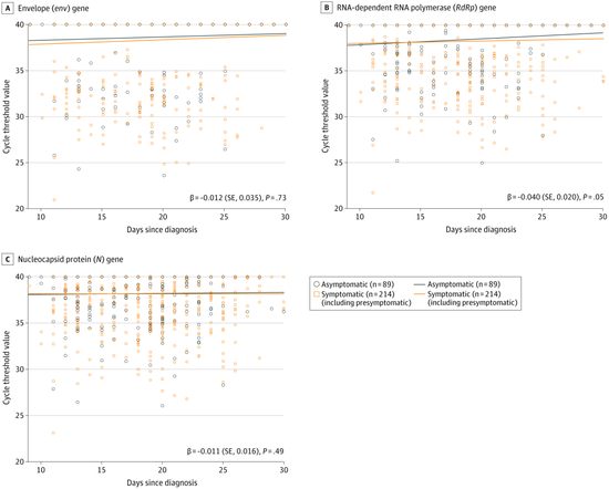核酸检测结果表明,无论是上呼吸道样本中新冠病毒env蛋白(编码包膜蛋白,envelope)和N蛋白(核衣壳蛋白,nucleocapsid)的基因序列,还是下呼吸道样本中新冠病毒RdRp (RNA依赖性RNA聚合酶)和N蛋白的基因序列检测,无症状感染者和有症状患者体内的病毒载量都基本相似。而且,从确认感染到解除隔离期间,比起有症状患者,无症状感染者下呼吸道样本中的病毒载量下降更慢。