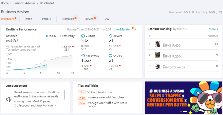 什么是生意参谋功能? "KnowYourBusiness,GrowYourBusiness" 一站式获得所有数据,助您增加销量 1.通过不同指标查看店铺的总体表现,关注重点改善方面 2.细致到SKU层面的数据帮助您获得宝贵的业务透析 3.持续更新顾客感兴趣的产品 如何使用生意参谋功能 1.Dashboard数据面板:向您展示店铺总体数据表现,每天9点(东8区时间)进行更新。 2.Realtim