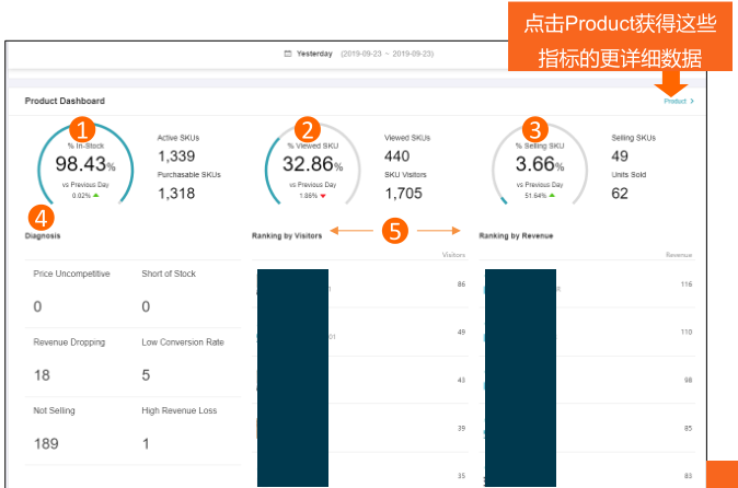 下拉Dashboard页面查看产品数据面板(选定时间内的):在此可以查看产品总体表现,以及热销品和滞销品的情况。