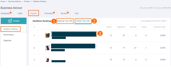 4. Realtime Ranking实时排名:点击More可查看实时销售前100的产品和访客前100的产品。