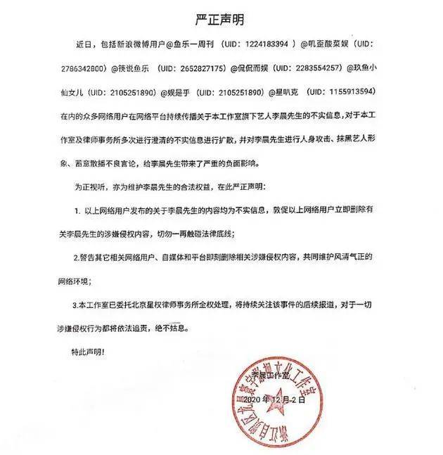 12月3日下午,李晨工作室微博发布严正申明,称对众多网络用户在网络平台传播关于李晨不实信息的行为将依法追责。
