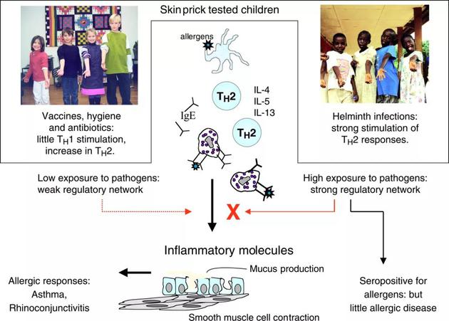 刚开始研究者认为,由于疫苗和抗生素等的推广,人类早期微生物感染大幅下降。这就导致了Th1发育不顺,使Th1/Th2免疫比例失衡。