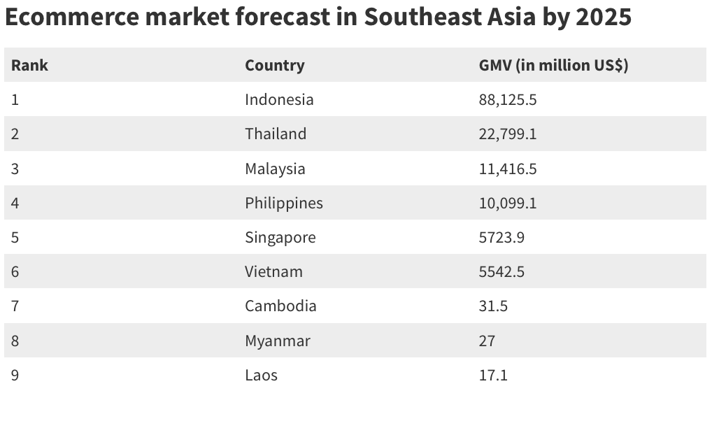 除东帝汶和文莱之外,东南亚 9 个主要市场的电商 GMV 总额将在 2025 年达到 1437 亿美元。这一数字低于谷歌(Google)、淡马锡(Temasek)和贝恩公司(Bain & Company)在 2020 年给出的 1720 亿美元预测值。《Tech In Asia》认为,两份报告之所以在预测数字上具有差异,其部分原因在于欧睿国际的报告中排除了 C2C、B2B 以及机动车销售等业务。