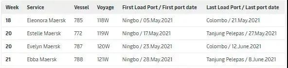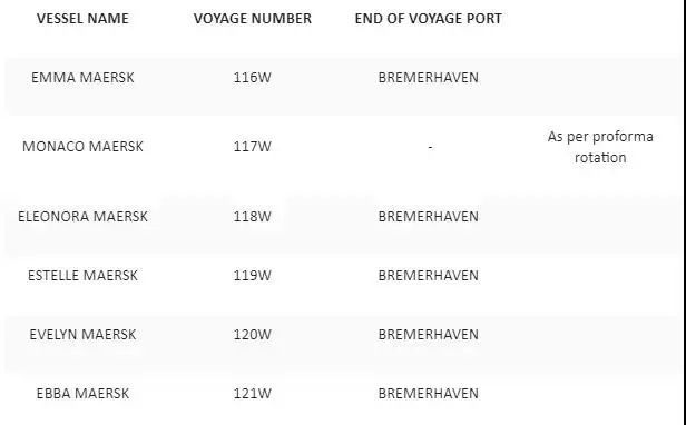 鉴于对船期可靠性考虑,马士基正在实施具体措施以提高其远东至北欧网络上的AE7服务的船期可靠性。由于汉堡港的堆场密度高且船舶在等待时间特别长,马士基决定在接下来的4个航次中不再挂靠汉堡,并将这些航次的卸货转移到不来梅NTB作为最终卸货港。马士基表示尽量确保以下替代路线来最大限度地减少对客户的影响。