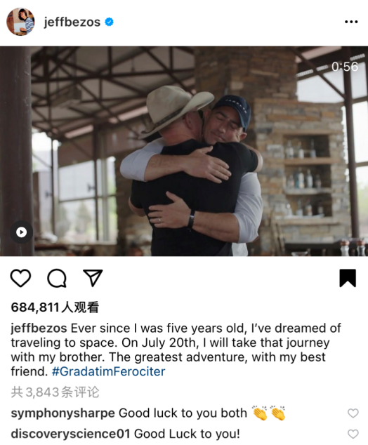6月7日,贝索斯在其个人社交平台ins上表示:从5岁起,我就一直梦想着去太空旅行。7月20日,我将和我的兄弟一起踏上这段旅程。最棒的冒险,和我最好的朋友。