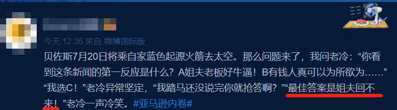 能做出这样的选择,看得出这些年姐夫把咱们亚马逊卖家都折磨成啥样了。而在大洋彼岸的国外网友又是如何看待的呢?推特上关于贝索斯上太空的话题也是讨论得热火朝天,而其中的一些网友观点和中国卖家的反应惊人得相似。
