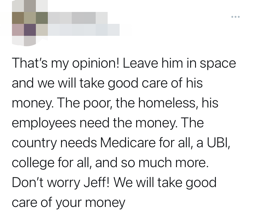 另外一名外国网友也表示达相同的观点,并直指亚马逊员工收入等话题:这就是我的意见!把他留在太空,我们会好好照顾他的钱。穷人,无家可归者,他的员工需要钱。这个国家需要全民医疗保险、全民基本收入、全民大学等等。杰夫别担心!我们会妥善保管您的钱。