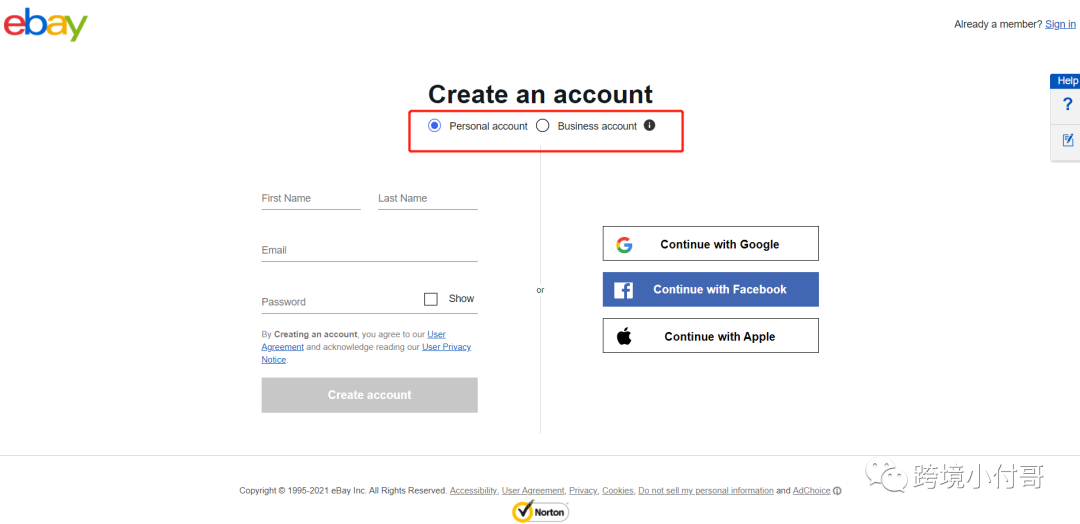 第二步,登录eBay官网,点击注册,进入到账号注册页面