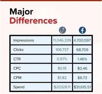 为了比较Facebook广告和TikTok广告的成本,Jungletopp进行了一项实验,他们在TikTok广告上花费了大约2万美元,在Facebook广告上花费了3万1美元,然后将结果进行了分析。