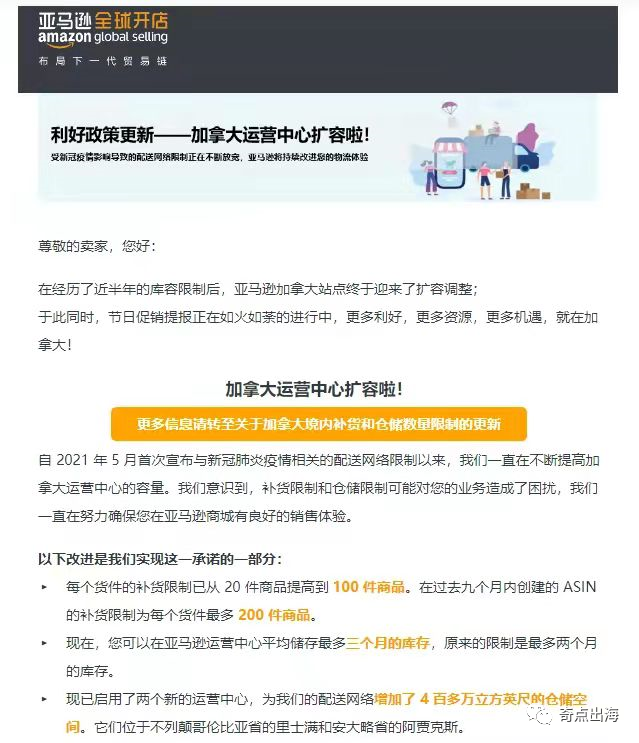 10月28日加拿大运营中心扩容,并且开启了两个新的运营中心的消息,对于为旺季奋战中的卖家来说无疑是个大好事!