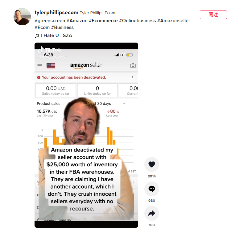 日前,一位名为Tyler Phillips的亚马逊卖家在TikTok上发布了一段视频,在视频中,他控诉亚马逊错误停用了自己的账号。