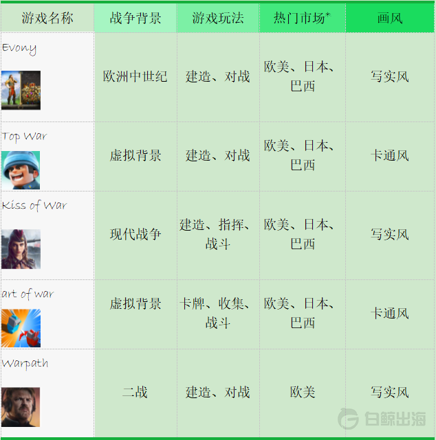 即便如此,根据 Sensor Tower 的数据显示,12 月《Warpath》iOS+Android 端的月流水也可以达到 600 万美金。虽然莉莉丝的这款游戏表现,只能算差强人意,但根据笔者对进入各个市场的出海 SLG 游戏的名称的统计,在游戏的名称中"war"这一关键词的出现频次依然非常高,比如 Tap4fun 旗下的《kiss of war》、89trillion 旗下的《art of war》等。可以看出,战争题材始终对 SLG 玩家具有吸引力。下面先通过一个表格对入榜的战争类 SLG 游戏做一下简单的盘点。