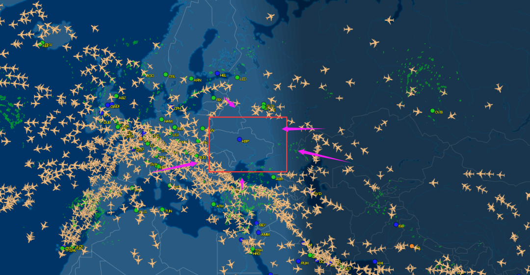 这个要分不同的情况说,若是走空运,不行,我们看这张图,乌克兰首都基辅KBP附近都是空白的,没有飞机。![]()