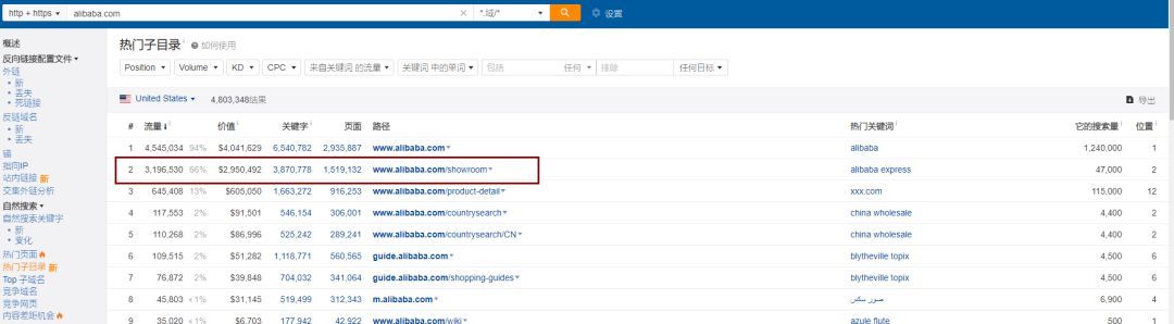 首先用Ahrefs工具,判断查看阿里巴巴权重最高的页面,可以看到除了阿里巴巴主域名www.alibaba.com,最大的权重都落在了阿里巴巴产品页面www.alibaba.com/showroom。