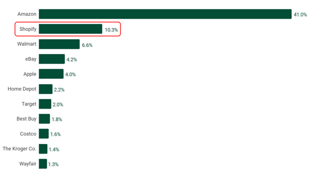 从全年来看,2021年Shopify总营收达46亿美元,超出分析师预期。该公司在2021年美国零售电商销售额中的份额占比达10.3%,超出沃尔玛、eBay等零售商,但距离首位的亚马逊仍有数量级的差距。