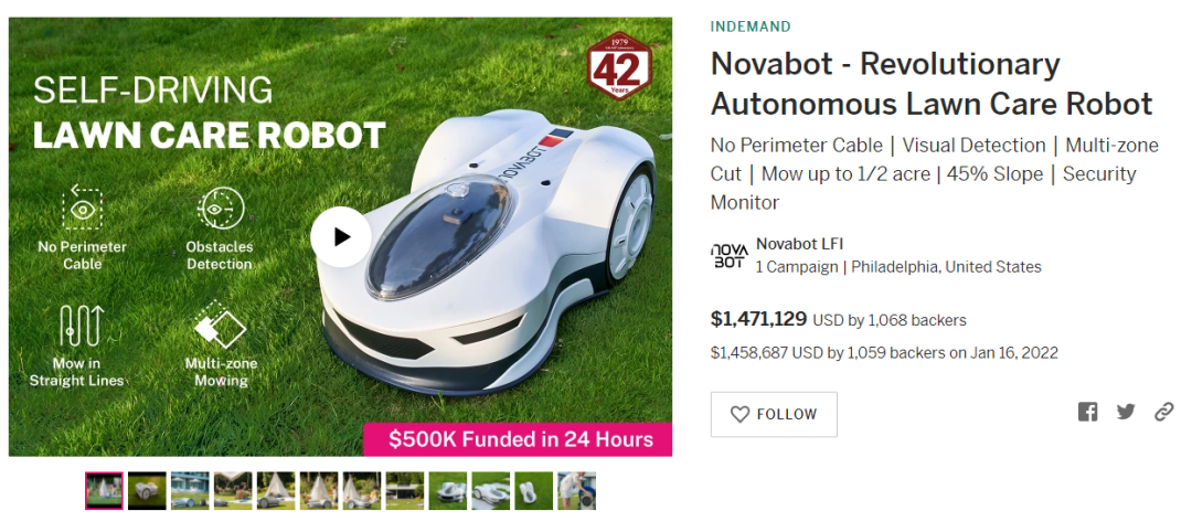 2021年11月17日Indiegogo上线了一款智能除草机器人---Novabot,其研发团队来自世界顶级机器人实验室之一的宾夕法尼亚大学GRASP实验室。除草机器人是该品牌的第一件产品,在海外毫无媒体曝光的情况下,上线仅一天,众筹金额就已高达50w美金,截至今日已完美落幕,总众筹金额1,471,129美元。