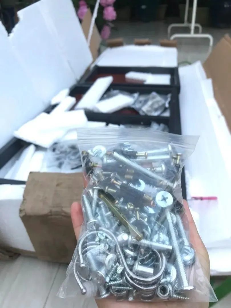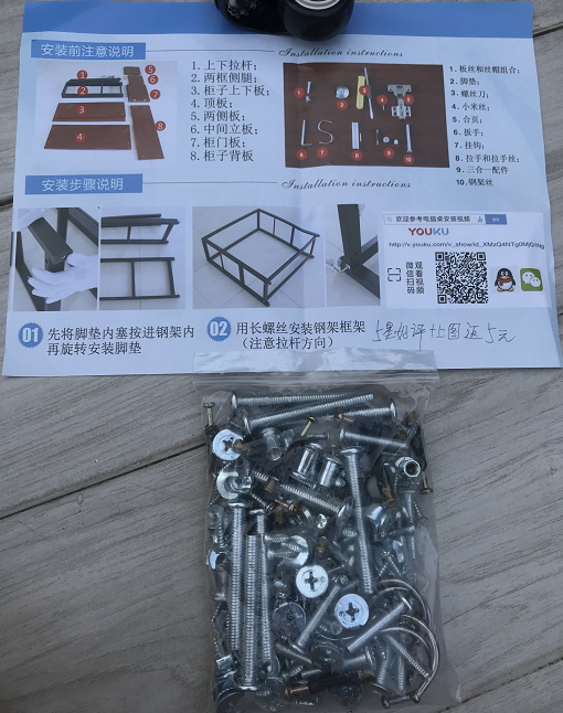 坐在地上研究了快10多分钟依旧不知道第一步该是用哪个钉子,很成功地就卡在了第一步. 看到安装指示的"5星好评+图片返5元"很能理解商家,但作为消费者的自己没有要留评的冲动,相反在想为什么商家要把所有的螺丝都混在一起,如果每一部分的螺丝钉按每一步的用小袋子分开然后在袋子外面贴上相应的序号,或许手残党的我还尝试去挑战一下.