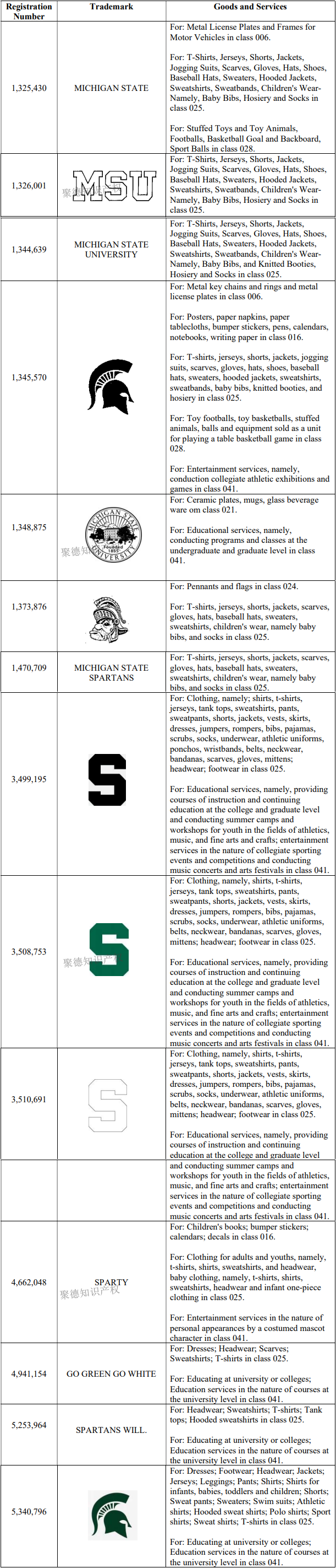 密歇根州立大学董事会拥有超过14件美国商标,类别包括但不限于服装,运动衫、衬衫、帽子等。商标有:![]()