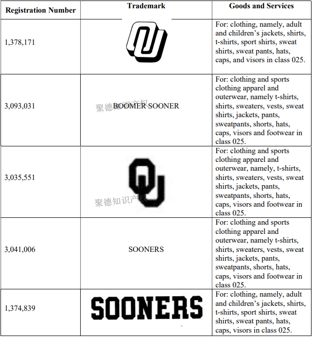俄克拉荷马大学成立于1890年,是俄克拉荷马州最古老的公立大学之一。拥有39个全国男子和女子运动冠军,包括7个全国足球冠军。同样,卡梅伦大学和罗杰斯州立大学的官方管理机构也是OU董事会。OU董事会拥有超过80个不同类别的商标,本次维权的商标比较少: