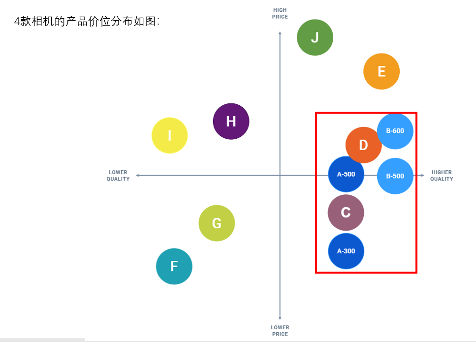 为了确认相机C和D是否真正对自己的品牌构成威胁,老王将市面上类似产品收集好,进行了价位和品质的分析,分布如图: