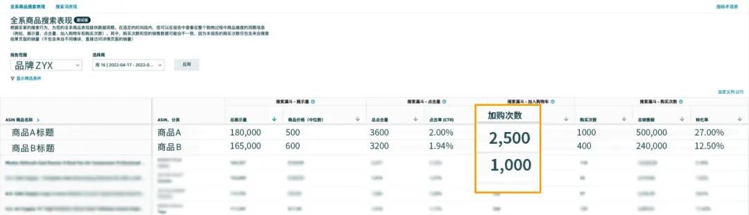 同时,根据亚马逊品牌分析工具的全系商品搜索表现报告(Search Catalog)看到,商品的加购数据却显示老王家相机A的加购数比升级版的新品相机B更高。