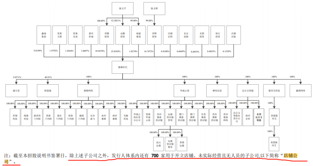 赛维时代招股说明书提到,赛维时代体系内拥有730家仅用于开店的子公司(即"店铺公司"),其中680家境内公司,50家境外公司。