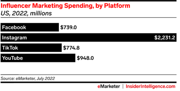 数据预测,2022 年在美国市场上,YouTube 上的网红营销支出费用将达到 9.48 亿美金,高于 Facebook 的 7.39 亿美金。此外,报告还指出,在使用网红营销的营销人员占比方面,TikTok 已经超过了 YouTube。