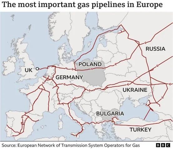 欧洲主要的天然气管道线路。图源:BBC