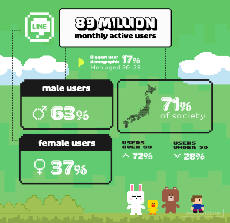 LINE拥有非常庞大的用户群,覆盖了超过70%的日本人口。其用户分布几乎反映了日本整个社会的人口结构。其男性用户占63%,女性用户占37%。