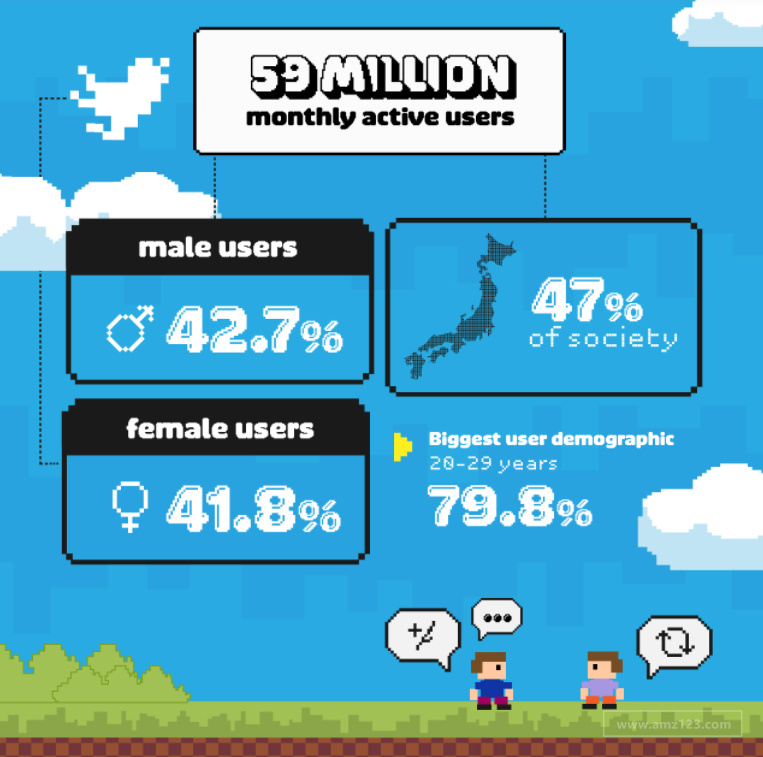 Twitter在日本的月活跃用户为5900万,约占总人口数量的47%。其中,男性用户数占比42.7%,女性则占41.8%。20到20岁的用户人群占比最大,为79.8%。