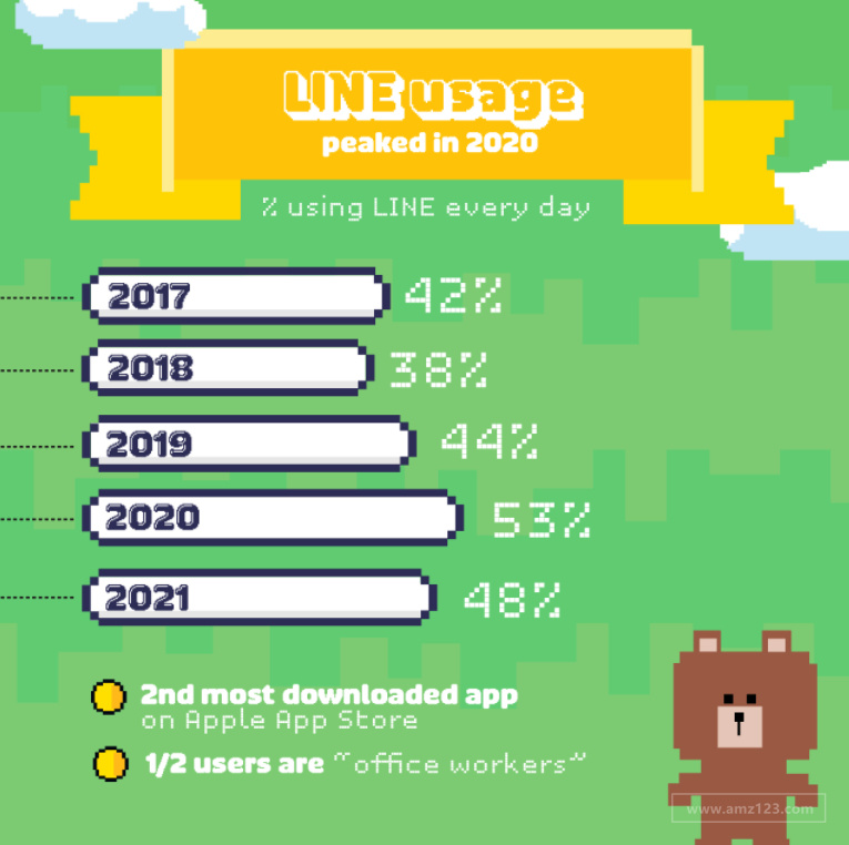 LINE从一个简单的即时通讯工具发展到现在,涵盖广告、通信和内容等核心商业板块,以及LinePay、AI、电商等多个业务板块,成为AppleAPPStore上下载量第二高的应用,其庞大的用户群吸引了越来越多的企业和品牌在该平台上投放广告。