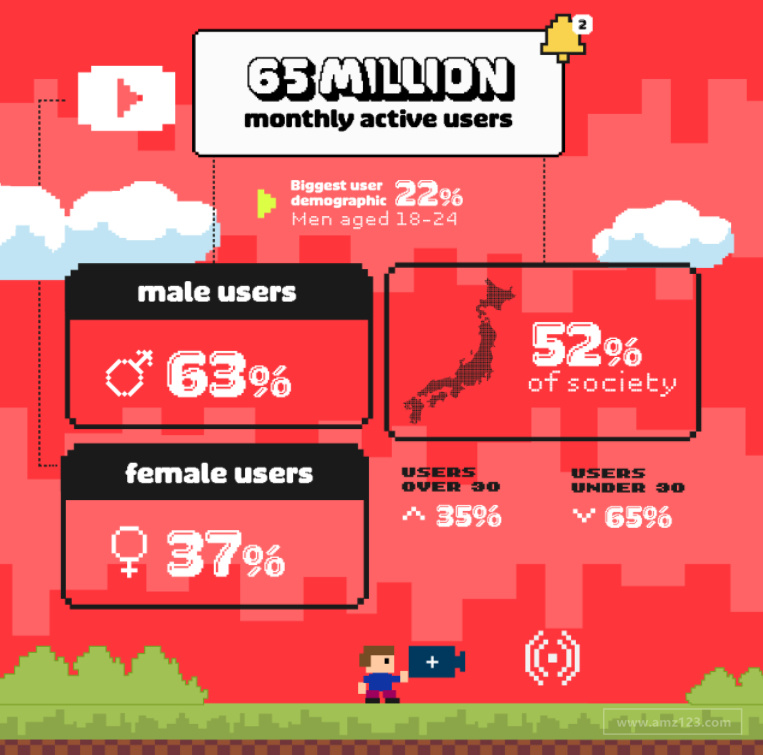 Youtube在日本的月活跃用户为6500万,约占总人口数量的52%。其中,男性用户数占比63%,女性则占37%。