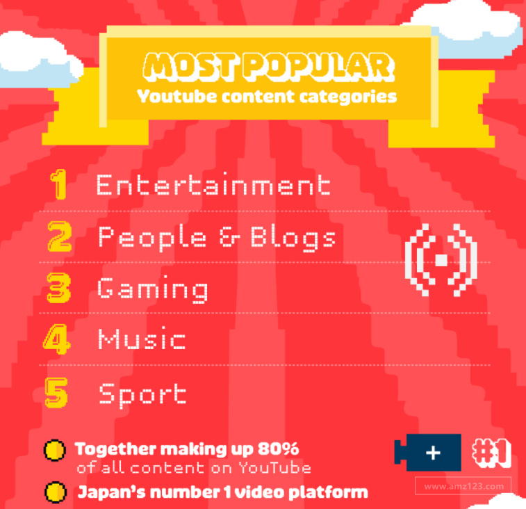 最受日本用户喜爱的内容板块是娱乐,紧随其后的是个人&博客、游戏、音乐和运动,这五个板块占据日本YouTube 80%的内容。