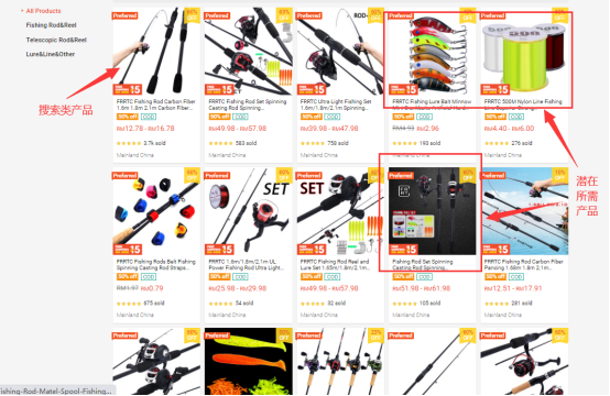 顾客B在平台搜索到一家专业做渔具的店铺,本想购买一个鱼竿,但是看了看其他其他产品也是需要了,比如渔轮,鱼线,鱼饵等,增加了店铺的销量,专卖店有个隐藏的好处就是会刺激消费者购买所需产品的配套产品,后续复购率明显高于百货店而且平台推量会很精准。