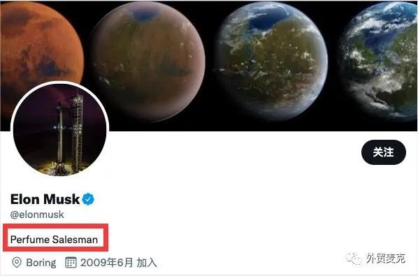 全球首富埃隆.马斯克摇身一变,成了Perfume Salesman,也就是香水销售员,连他的签名都改了: