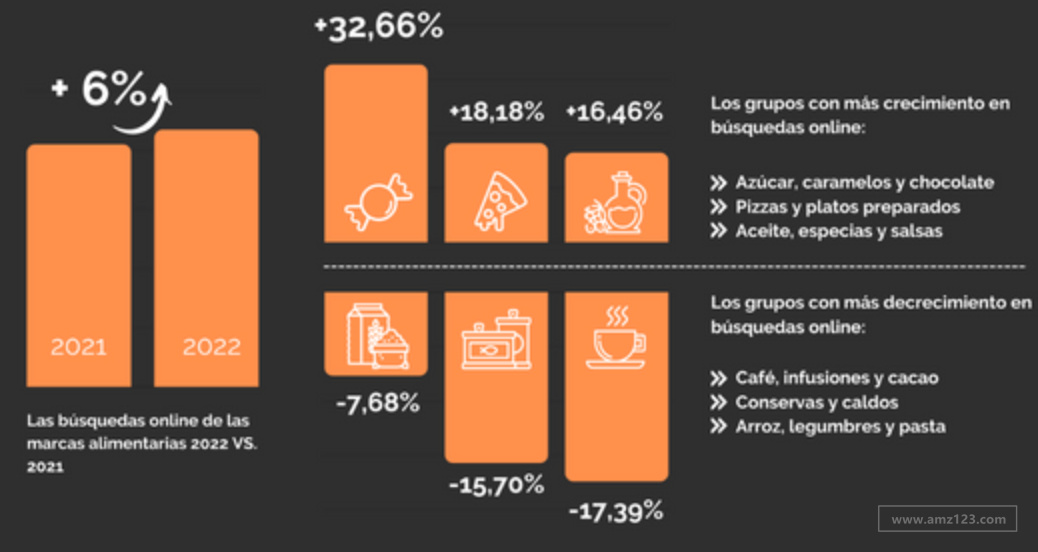 AMZ123获悉,根据MarketingNews.es门户网站的数据,后疫情时代在高通胀率导致用户购买力下降的背景下,消费者似乎对健康饮食失去了兴趣。Raw Agency的报告"西班牙大众消费食品的数字存在"分析了谷歌、其自己的网站和近600个快速消费品的社交网络上的搜索数据,2022年第一季度快速消费品食品品牌的在线搜索量增长了6%。