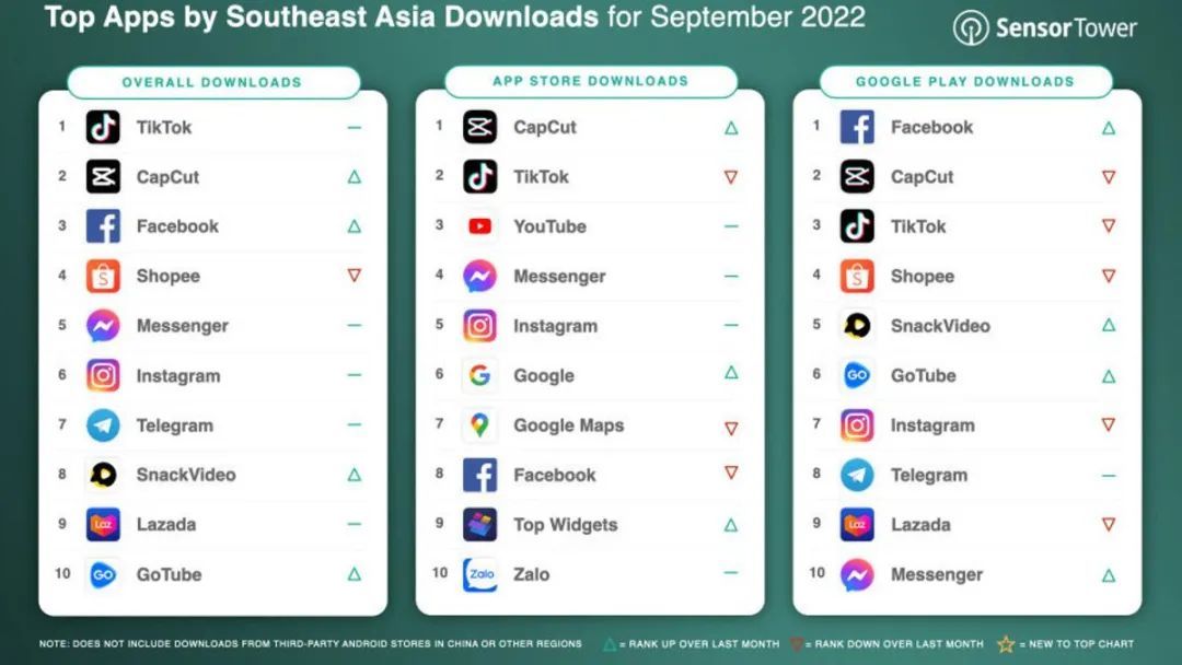 2022 年 9 月东南亚最受欢迎的 10 款 App 分别为:TikTok、Capcut、Facebook、Shopee、Messenger、Instagram、Telegram、Snack Video、Lazada 和 GoTube。