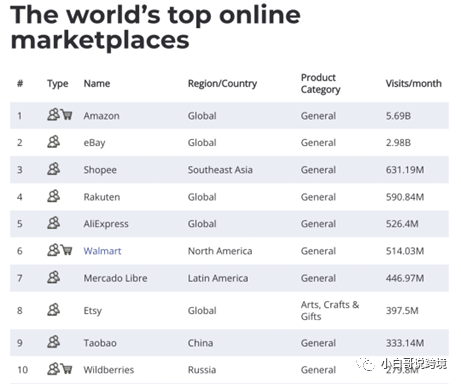 亚马逊和eBay位居榜首也就不足为奇了,亚马逊每月的访问量超过 55 亿次,而 eBay 每月的访问量接近30亿次。只有亚马逊和eBay的访问量突破了10亿次大关,尽管 Shopee、Mercado Libre、乐天、沃尔玛和速卖通也紧随其后,每个月的访问量都在 5 亿左右。