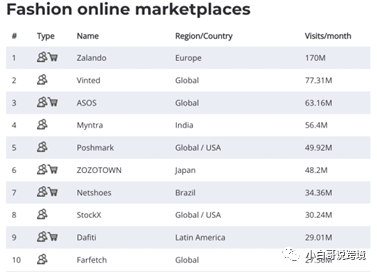 服装和配饰是最受欢迎的电商销售品类之一,Zalando在这一品类中领先,其次是Vinted、ASOS、Myntra、Poshmark、ZOZOTOWN、Netshoes和StockX,它们都位列前50名最大的在线市场。 大多数时尚电商平台都专注于美国、欧洲、拉丁美洲或全球的客户,但澳大利亚、东南亚、日本、印度和俄罗斯也有分布。