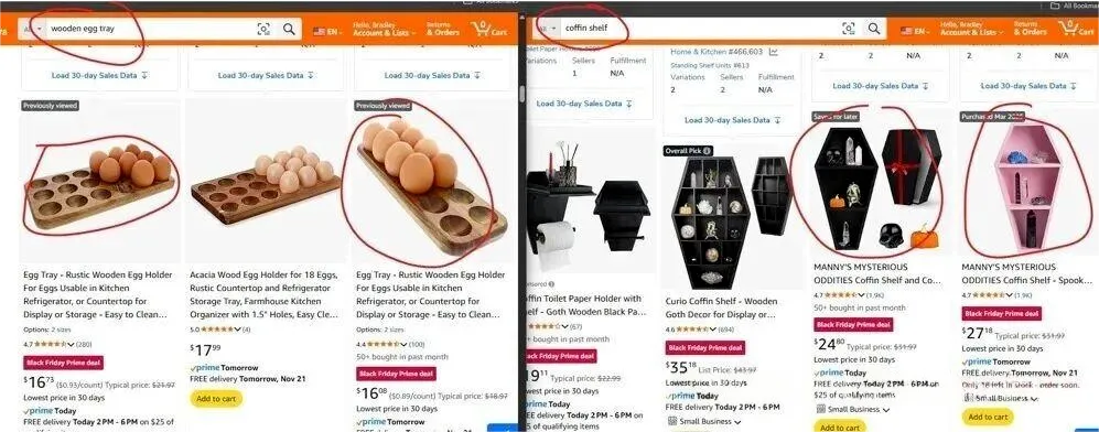 无论是搜索 "wooden egg tray",还是"coffin shelf",你都能看到: