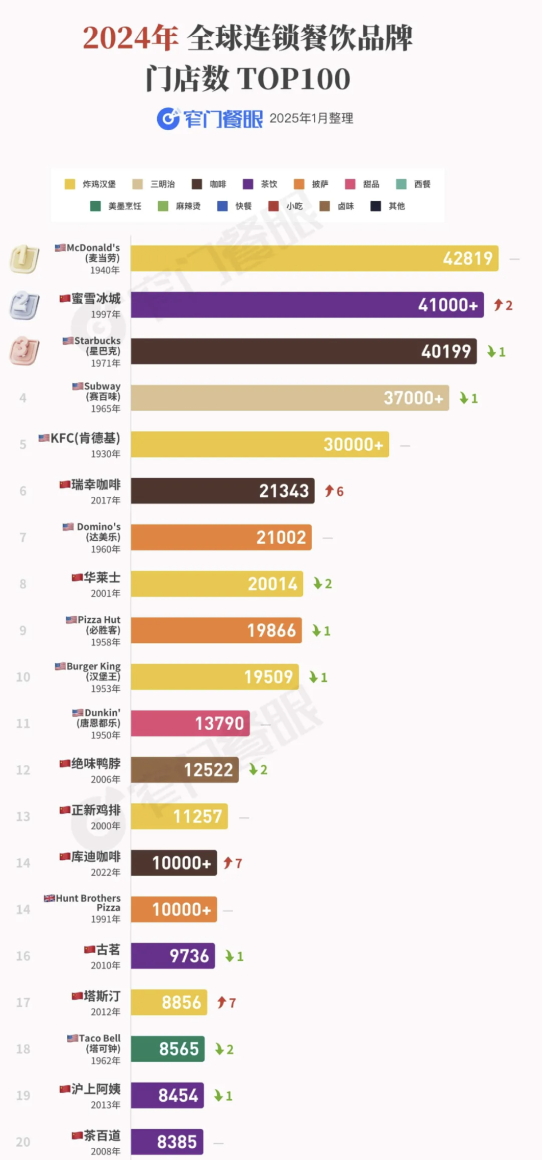 从规模来看,放眼全球,中国餐饮的连锁能力确实出众。今年年初,窄门餐眼做了一个2024全球连锁餐饮门店数 Top 100的排行榜。从这个排行榜可以看出:除了麦当劳、肯德基、赛百味等上一代制霸全球的餐饮连锁企业之外,有大量来自中国的企业在全球名列前茅;全球门店数 Top 20中有一半中国公司,其中最低的也有超过8000家门店。