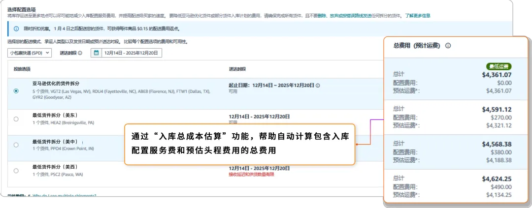 新功能2-入库总成本估算:系统会自动汇总计算不同选项的入库总成本(包含入库配置费与预估运费),卖家可以直接做横向对比,更快锁定最省钱的入库方案。