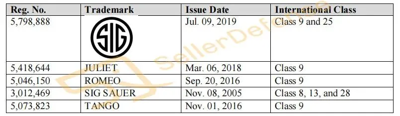 原告 SIG SAUER INC. 是美国领先的轻武器、光电瞄具及训练系统制造商。本案涉及商标如下注册在多个类目,请相关卖家注意排查避雷!