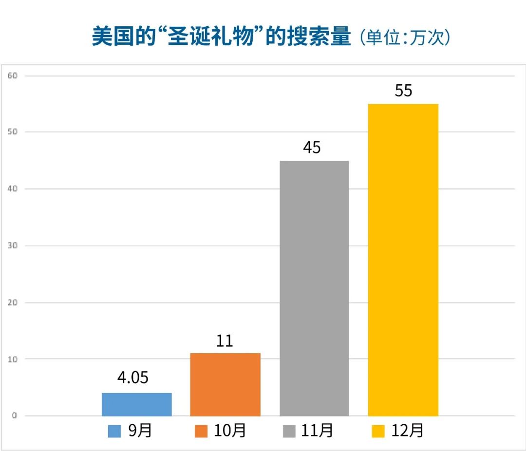 根据 2021 年的Kantar 调查,39% 的美国消费者和 42% 的英国消费者准备最早在 10 月开始进行假日购物[1]。同样,在2020年的数据中,即使离圣诞节还有三个月,但是美国消费者从9月份起就会搜索"圣诞礼品",往后搜索量逐月大幅地递增,最后到12月到达顶峰。