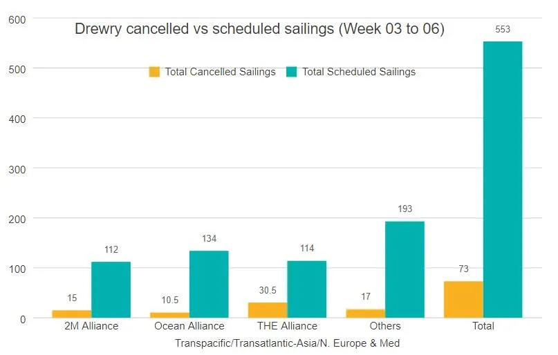 在2022年第3周至第6周期间,共有73个航次被取消,取消率为13%。